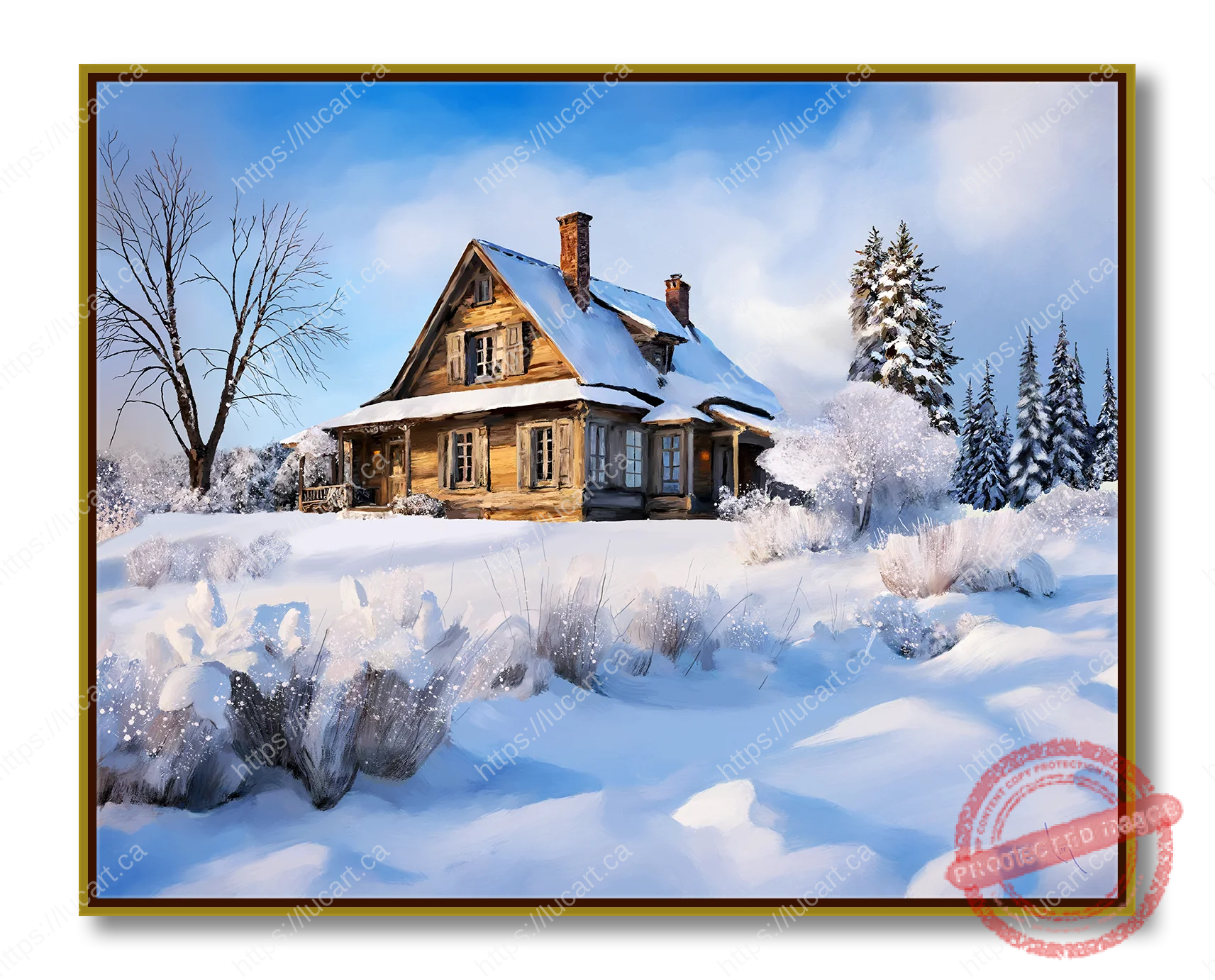 « Chuchotement Silencieux de l’Hiver » capture la beauté sereine d’un paysage hivernal, présentant une scène tranquille qui invite les spectateurs à entrer dans un refuge paisible à la campagne. Au centre de la composition se trouve une charmante maison en bois, recouverte d’une douce couche de neige. La maison arbore un toit à deux versants raides orné de neige accumulée, avec deux cheminées et plusieurs fenêtres qui reflètent subtilement la douce lumière hivernale. Ce foyer rustique est niché dans un décor pittoresque de sol enneigé, d’arbustes et d’arbres, chaque élément étant méticuleusement détaillé pour évoquer l’élégance tranquille de l’hiver.