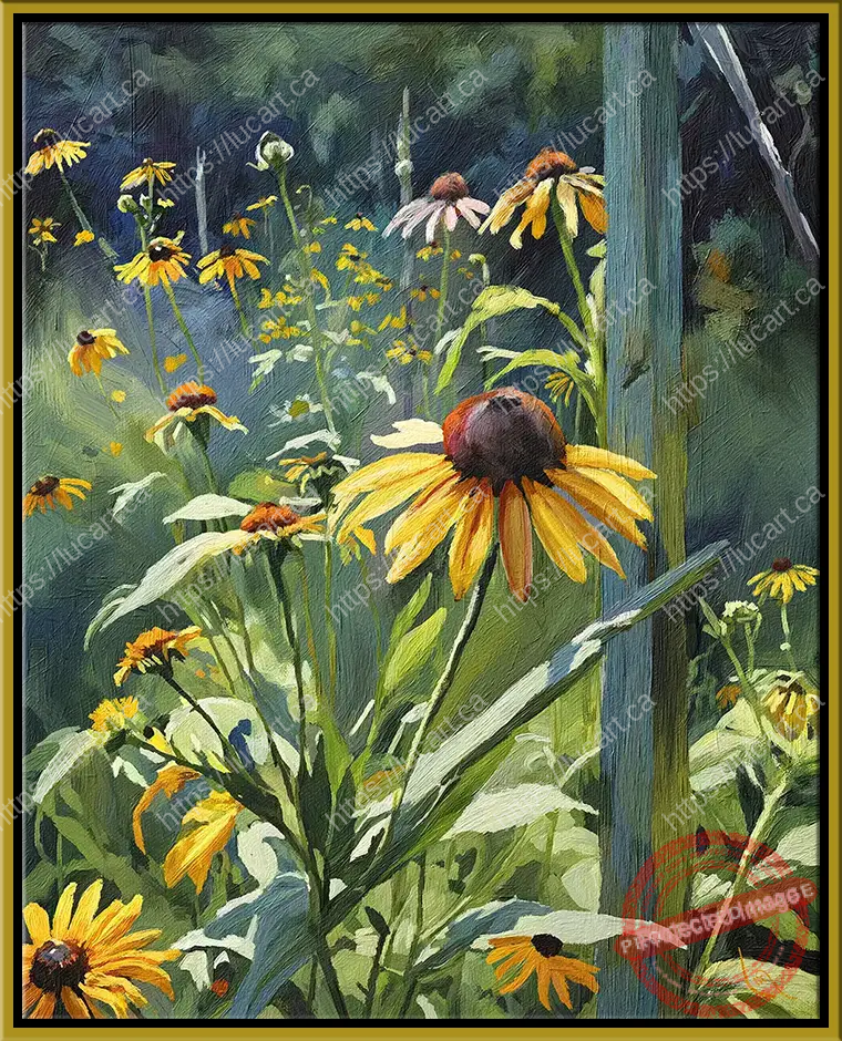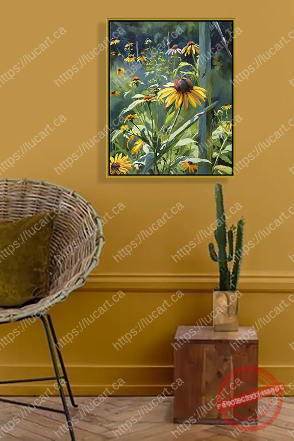 Un bouquet de rudbeckias jaunes, animé par une palette lumineuse et riche. La composition met en avant une fleur centrale, aux pétales vibrants et au cœur brun foncé, qui capte immédiatement le regard. Autour d’elle, s’épanouissent tiges et feuilles vertes, détaillées avec soin, tandis qu’un arrière-plan de verts et de bleus plus doux esquisse une végétation foisonnante sans jamais distraire de l’élément principal. Une ligne verticale bleu-vert traverse discrètement la scène, apportant une structure subtile à cet ensemble fluide et naturel.