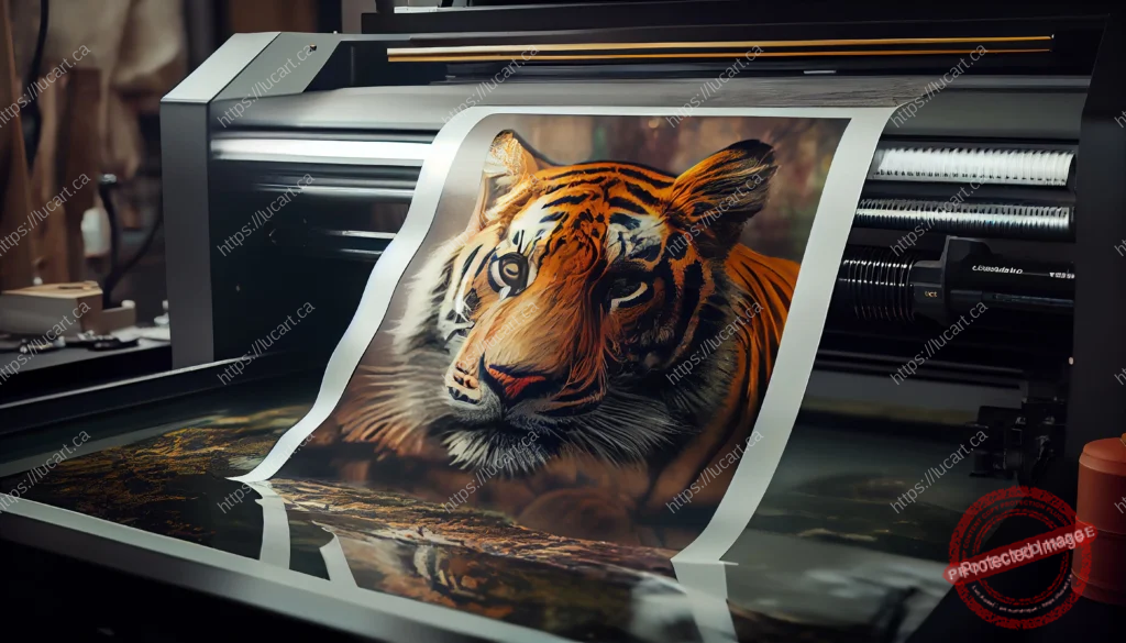L’impression giclée permet de produire des œuvres de qualité muséale, réalisée avec des encres pigmentaires sur canevas ou sur papier aquarelle de 400 gsm. Cette impression constitue la base visuelle de l’œuvre. Après l’impression, des interventions manuelles sont effectuées directement sur le support : ajouts de couleurs et rehauts sélectifs afin d’enrichir la surface picturale et d’accentuer certains éléments de la composition.