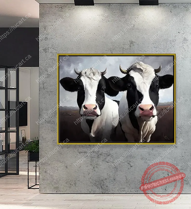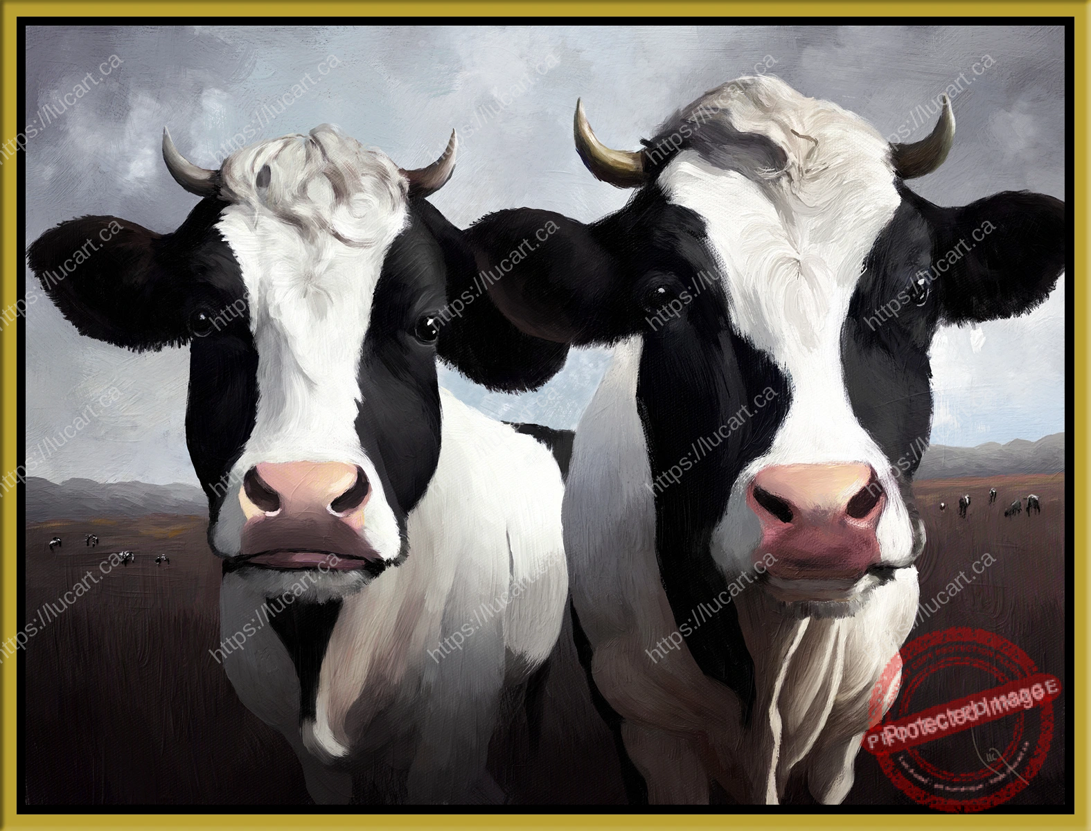 Les yeux d’une immensité tranquille présente deux vaches Holstein placées côte à côte, leur regard droit et captivant occupant le premier plan de la composition. La précision du détail révèle la texture douce de leur pelage contrastant avec les marques noires et blanches caractéristiques de leur race. Leurs grands yeux expressifs, presque interrogateurs, semblent inviter le spectateur à une rencontre silencieuse, profondément humaine malgré la simplicité apparente du sujet.